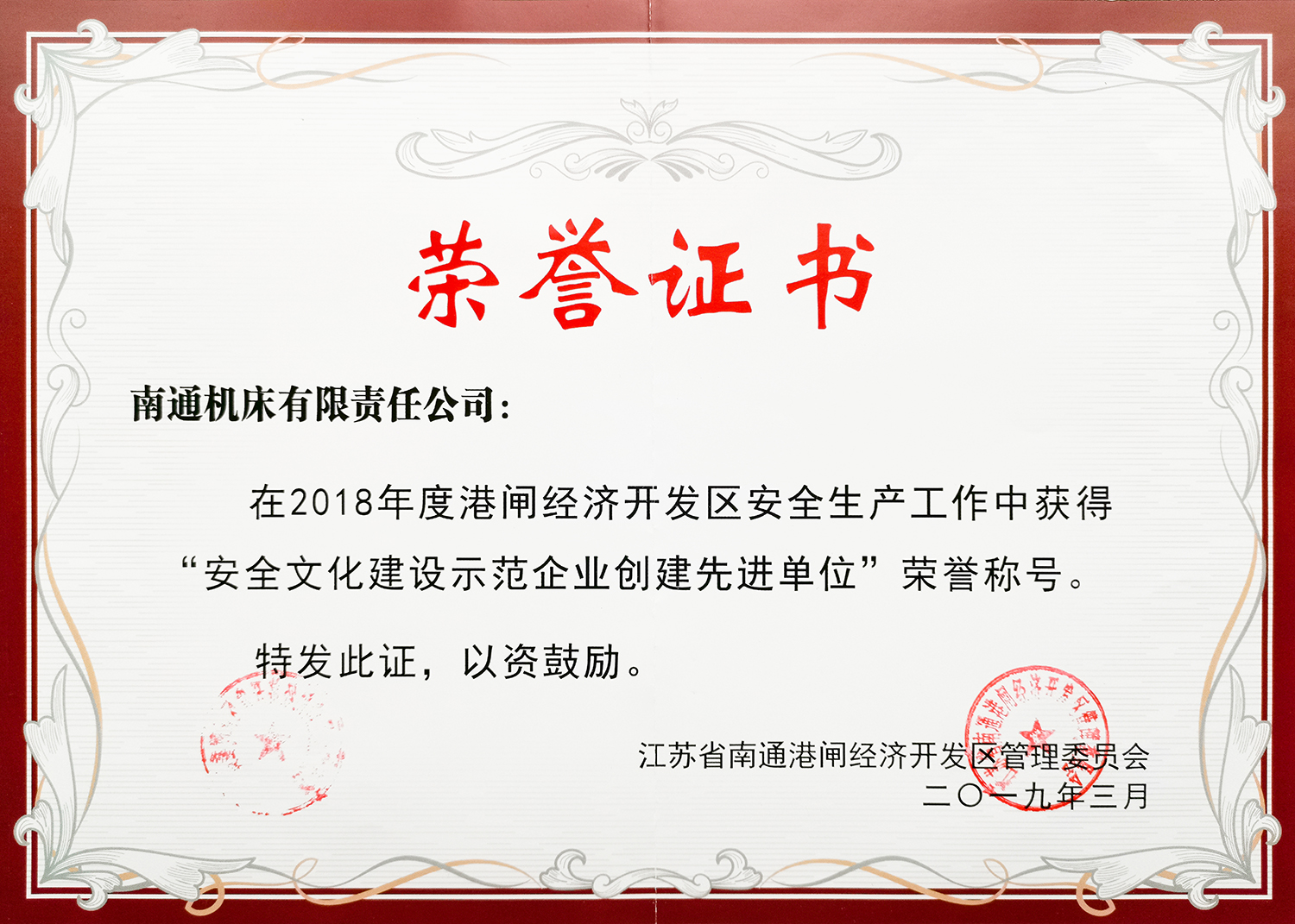 近日,南通市港閘區(qū)政府表彰了2018年度港閘經(jīng)濟(jì)開發(fā)區(qū)安全生產(chǎn)先進(jìn)集體和先進(jìn)個(gè)人。南通機(jī)床獲 “安全文化建設(shè)示范企業(yè)創(chuàng)建先進(jìn)單位”榮譽(yù)稱號。