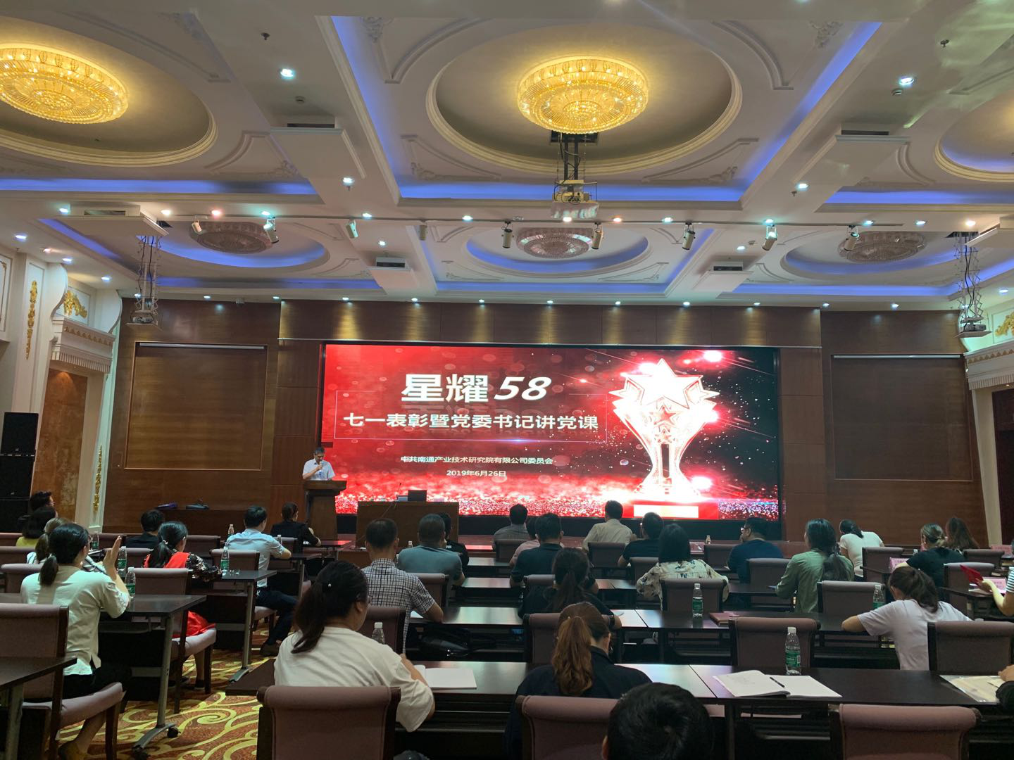 6月26日,為表彰先進、弘揚正氣,做好“不忘初心,牢記使命”主題教育活動,在建黨98周年,建國70周年之際,南通產業(yè)技術研究院隆重舉辦了2019年度“七一”表彰大會暨黨委書記上黨課活動。產研院、先進院全體人員、園區(qū)企業(yè)部分黨員代表參加了會議。