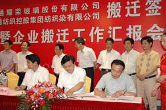 7月8日,在市經(jīng)貿(mào)委主持下,我公司與耀榮玻璃、紡織染簽訂《企業(yè)搬遷合同》。市政府徐輝副市長、宗劍峰及崇川區(qū)、通州區(qū)、政府相關(guān)部門及我公司有關(guān)領(lǐng)導出席簽約儀式。
