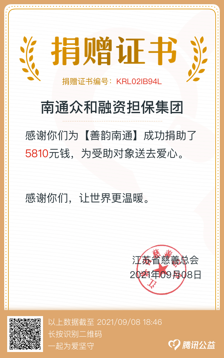為進(jìn)一步弘揚中華民族扶貧濟困的傳統(tǒng)美德,倡導(dǎo)“以人為本,樂于奉獻(xiàn)”的互助精神,眾和擔(dān)保積極發(fā)動發(fā)動、廣泛宣傳,第一時間組織全體干部職工開展“慈善一日捐”活動。公司領(lǐng)導(dǎo)班子成員率先垂范,帶頭捐款,全體干部職工踴躍參與,奉獻(xiàn)愛心,參與度100%。截至9月8日,共籌得善款5810元,募集資金將統(tǒng)一交至南通市慈善總會,用于扶貧、慈善救助項目。